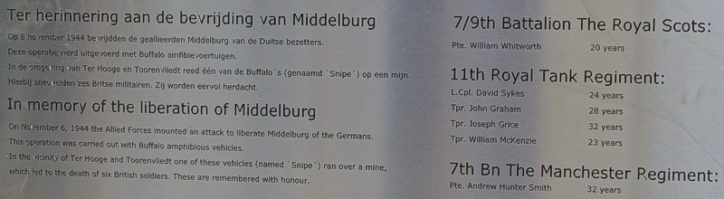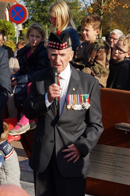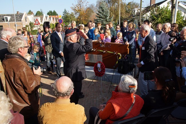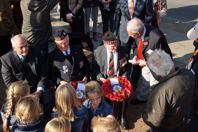 Van links naar rechts: 1. Mr. Rory Johnston, de zoon van Major Hugh Johnston. Deze majoor werd tijdelijk bevorderd zodat de Duitse generaal Daser zich voor zijn gevoel "eervol" kon overgeven. 2. Sergeant Jack Hall. Hij overleefde het incident. 3. Major Joe Lawler Brown, Royal Scots. 4. Dhr Bob van der Weel, initiatiefnemer van het monument. -