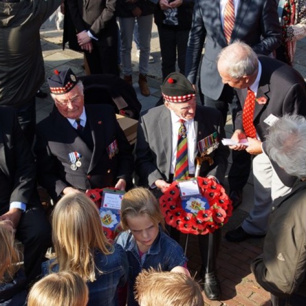 Beide veteranen leggen kransen en brengen de groet. -