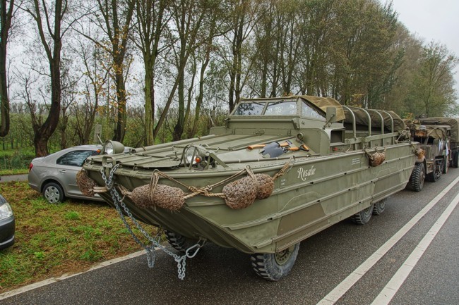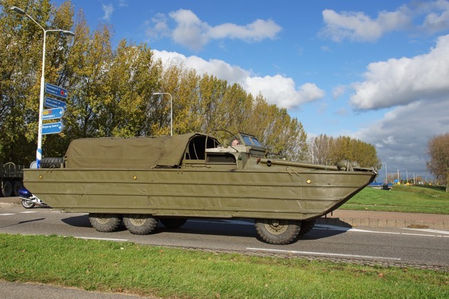 De Dukw is een amfibisch transportvoertuig met wielen. -