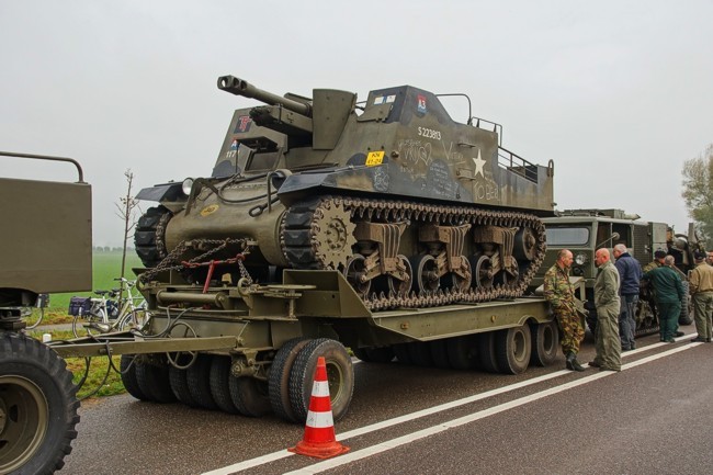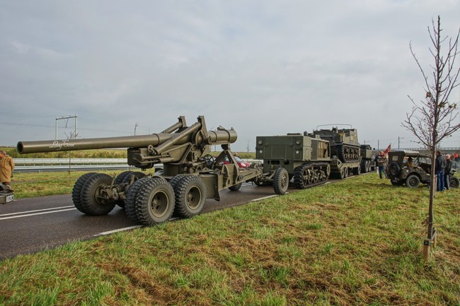 De zware artillerie van de geallieerden bestond onder meer uit deze M1 Long Tom. Het kaliber is 15,5 cm. Hij wordt hier getrokken door een M4 high speed tractor. Deze kanonnen gaven begin november 1944 vanuit Zeeuws-Vlaanderen vuursteun aan de operaties op Walcheren. -
