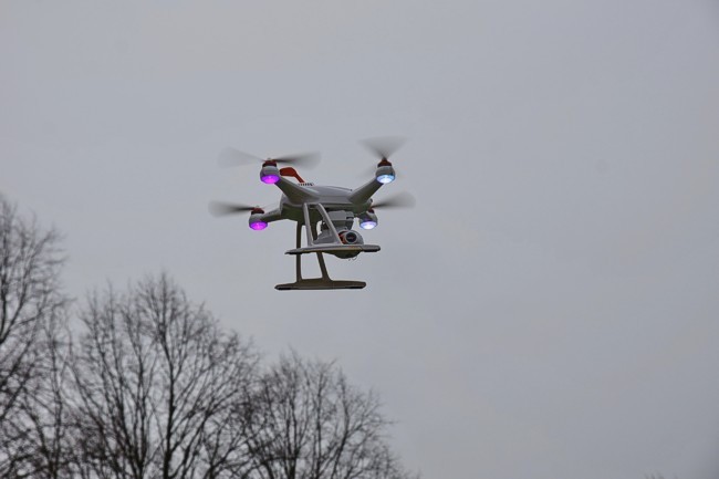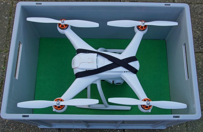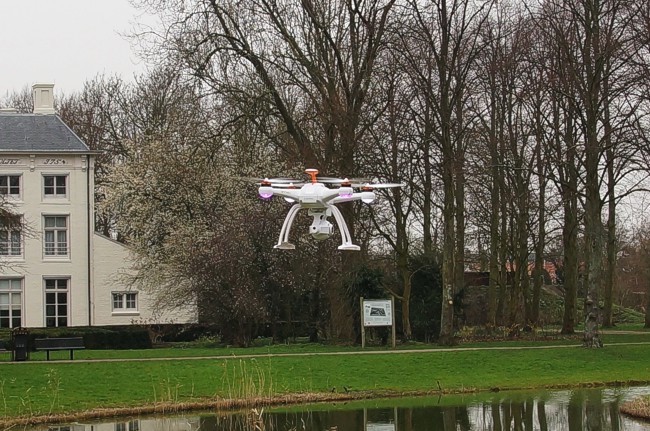 Voor het eerst los van de grond. De vier propellers bieden een stabiel platform voor de HD camera. -